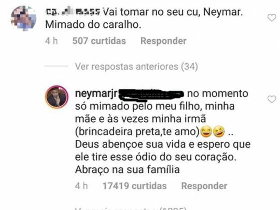 Neymar Jr. saiu por cima ao ser ofendido por um seguidor depois que postou um vídeo no seu instagram, nesta sexta-feira (9). Nos comentários um rapaz o chamou de mimado, e o atleta não se abateu com a ofensa e rebateu com categoria.