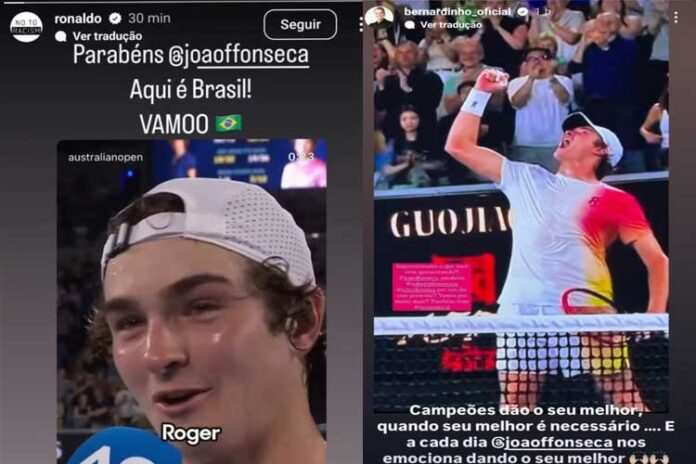 Ele lesionou o ombro durante os treinos, mas isso não o impediu de celebrar a vitória do jovem tenista. “Vamooo!”, escreveu em seu Stories. O ex-jogador Ronaldo Nazário também homenageou o jogador de tênis por sua vitória, usando o seu famoso bordão “Aqui é Brasil” em post nas redes sociais. “Parabéns João Fonseca. Aqui é o Brasil! Vamoo!”, escreveu.