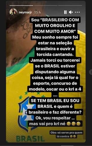 O atacante da seleção iniciou a publicação afirmando que é brasileiro com muito orgulho e com muito amor. Por isso, o seu grande sonho sempre foi estar na Seleção Brasileira e, também, sentir a emoção de escutar a torcida cantando.