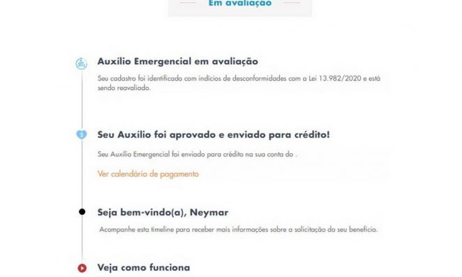 Neymar é mais um famoso a ser vítima no cadastro do auxílio emergencial do governo. Alguém cadastrou o nome do camisa 10 para receber os R$ 600,00 oferecidos pelo governo e já estava ”em avaliação”. Neste caso, segundo as informações do Jornal ”O Globo”, o jogador diz que não tem conhecimento sobre isso e que não fez nenhuma aplicação. Ou seja, ele nega que tenha sido ele.