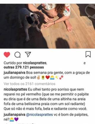 Juliana respondeu o comentário: “Nicolas, você é bom de palpites, né?”, e colocou uma imagem de coração e outra de um pôr do sol.