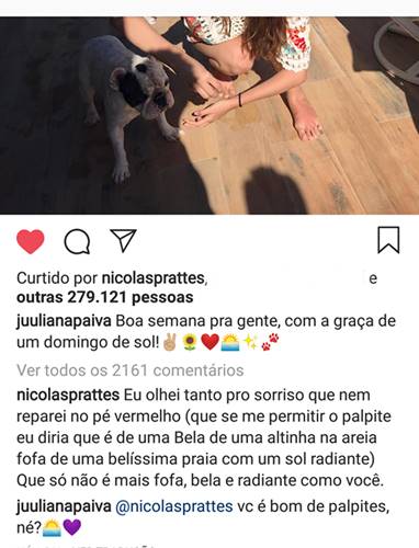 “Eu olhei tanto para o sorriso que nem reparei no pé vermelho (que se me permitir o palpite, diria que é de uma bela de uma altinha na areia fofa de uma belíssima praia com um sol radiante). Que só não é mais fofa, bela e radiante como você”, comentou o autor.