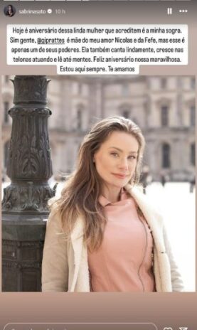 Sato também a homenageou em seus stories do Instagram: “Hoje é aniversário dessa linda mulher que, acreditem, é a minha sogra. Sim, gente. Giselle Prattes, é mãe do meu amor, Nicolas e da Fefe, mas esse é apenas um de seus poderes”.