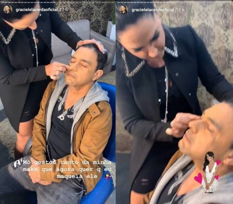 Na noite deste último sábado (25), Graciele novamente estava presente e mostrou em suas redes sociais ser mais do que uma simples companheira. Mostrou que também é maquiadora de seu amado.