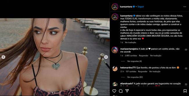 Ontem, 08 de março, foi comemorado o Dia Internacional da Mulher. Sendo assim, o cantor e compositor Luan Santana, 32 anos, resolveu prestar uma linda homenagem às mulheres presentes em sua vida. Um fato chamou a atenção de olhares mais atentos: o artista postou uma foto de Jade Magalhães na publicação que realizou em uma de suas redes sociais e surpreendeu.