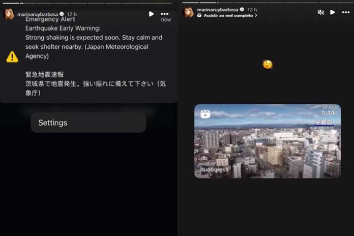 Através de seus Stories no Instagram, Marina compartilhou a mensagem recebida alertando sobre o terremoto. “Forte tremor é esperado em breve. Fique calmo e procure abrigo nas proximidades”, diz o texto.