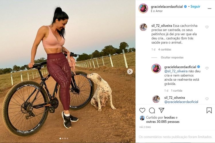 “Essa cachorrinha precisa ser castrada, os seus peitinhos já dei pra ver que ela deu cria… castração também traz saúde para o animal”, disse a internauta, que recebeu a seguinte reposta de Graciele Lacerda: “Não deu cria e nem sabemos ainda se realmente está grávida”, respondeu. Veja na imagem capturada pela equipe de arte do Área VIP abaixo: