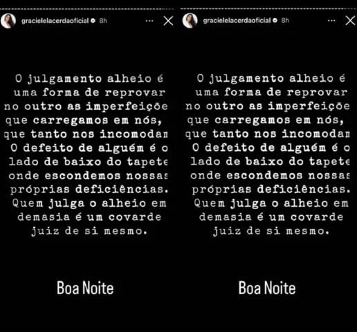 ”O julgamento alheio é uma forma de reprovar no outro as imperfeições que carregamos em nós, que tento nos incomodam. O defeito de alguém é o lado de baixo do tapete onde escondemos nossas próprias deficiências. Quem julga o alheio em demasia é um covarde juiz de si mesmo”, dizia a mensagem.