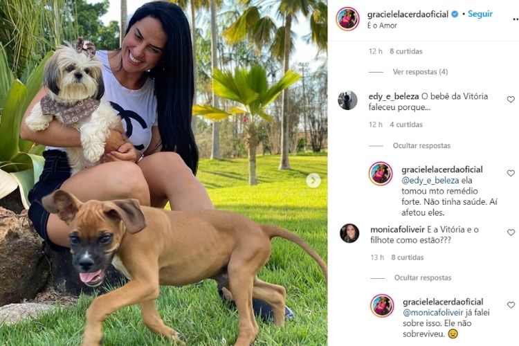 Nos comentários, os fãs só quiseram saber da cachorrinha Victória, que estava grávida e acabou perdendo o filho: “O bebê da Victória faleceu por que?”, questionou o internauta, sendo respondido por Graciele Lacerda: “”Ela tomou muito remédio forte e não tinha saúde. Aí afetou ele”, disse.
