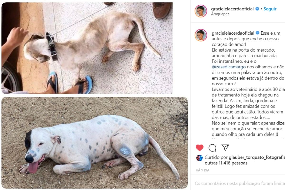 A noiva do cantor sertanejo Zezé di Camargo, a jornalista e educadora física Graciele Lacerda resolveu utilizar as redes sociais para encher os fãs de orgulho. É que ela compartilhou o antes e depois de um cachorrinho que encontrou na rua e o cuidou junto com o seu amado.