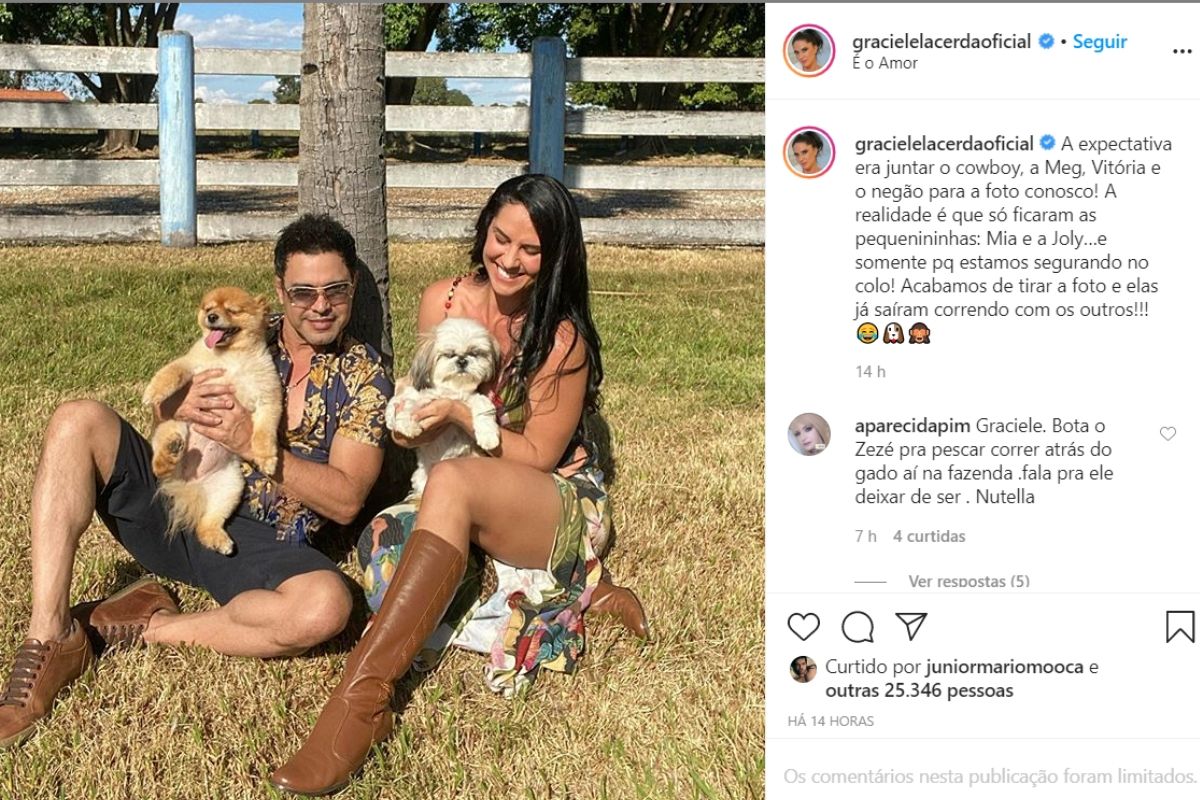 Na legenda da publicação, Graciele Lacerda contou que tentou juntar todos os pets para tirar a foto, no entanto, só restaram as pequenininhas: “A expectativa era juntar o Cowboy, a Meg, Vitória e o Negão para a foto conosco! A realidade é que só ficaram as pequenininhas: Mia e a Joly…e somente pq estamos segurando no colo! Acabamos de tirar a foto e elas já saíram correndo com os outros”, disse ela. Veja na imagem abaixo separada pela equipe do Área VIP:
