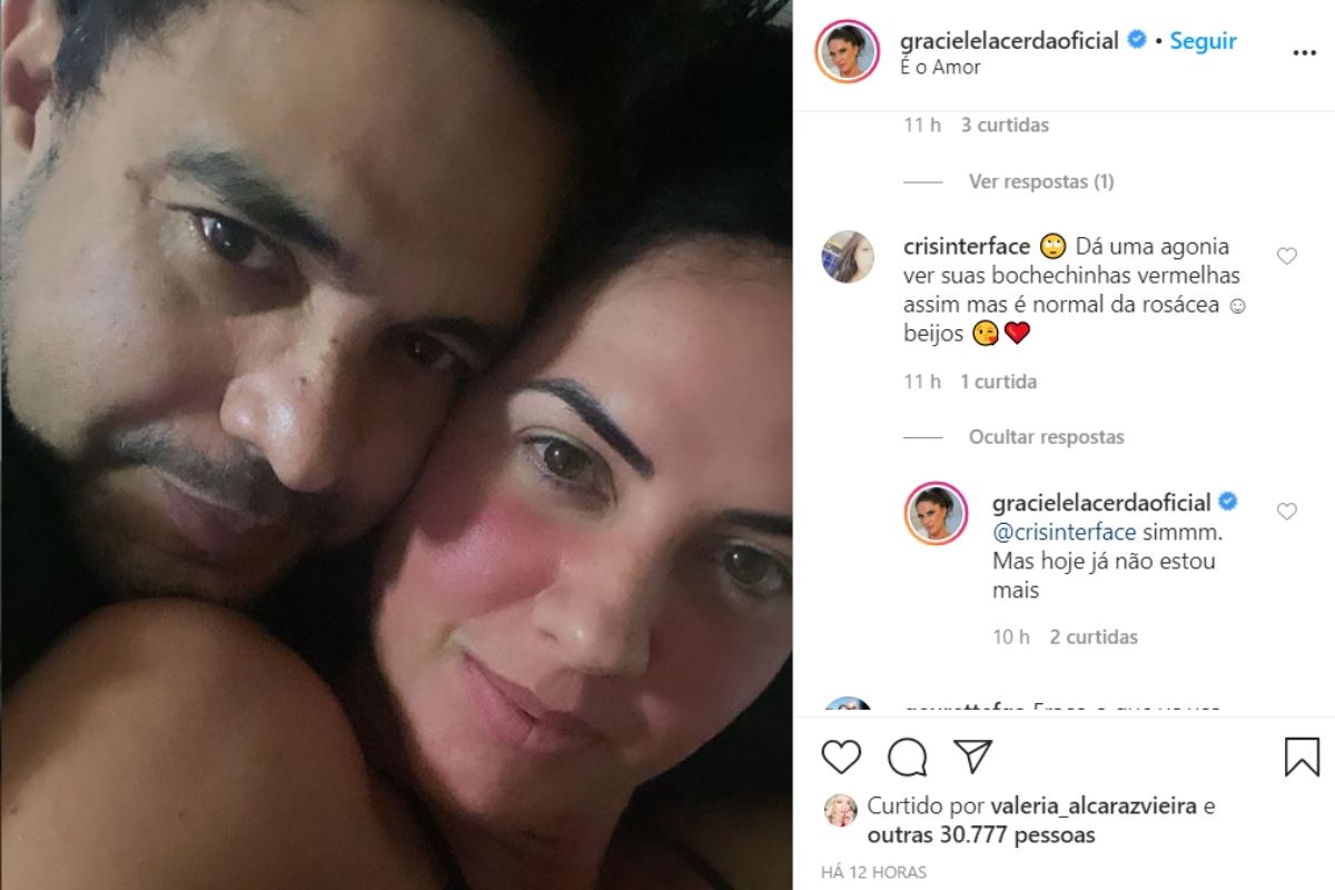 A imagem, que ultrapassou a casa das 30 mil curtidas, recebeu inúmeros comentários dos seus mais de um milhão de seguidores e um deles chamou a atenção de Graciele Lacerda. Na mensagem, a internauta falou sobre uma inflamação que a jornalista e educadora física teve: “Dá uma agonia ver suas bochechinhas vermelhas assim mas é normal da rosácea. Beijos”, disse.