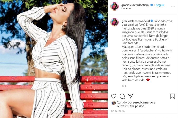 Noiva do cantor sertanejo Zezé di Camargo, da dupla com o irmão Luciano, a jornalista e educadora física Graciele Lacerda utilizou as suas redes sociais na noite desta última segunda-feira (22), para fazer um desabafo e tanto. É que ela fez uma análise sobre os planos que tinha para este ano de 2020, mas que foram frustrados por conta da pandemia da Covid-19, doença causada pelo novo coronavíurs.