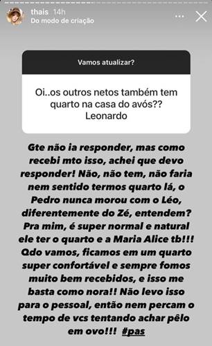“Gente, não ia responder, mas como recebi muito isso, achei que devo falar! Não, não tem e não faria sentido termos quarto lá. O Pedro nunca morou com o Léo, diferentemente do Zé, entendem? Para mim, é super normal e natural ele ter o quarto e a Maria Alice também”, começou ela.
