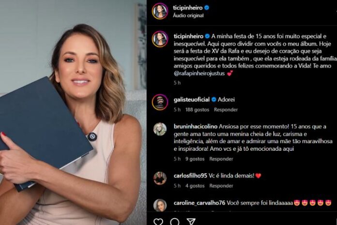 “A minha festa de 15 anos foi muito especial e inesquecível. Aqui quero dividir com vocês o meu álbum. Hoje será a festa de XV da Rafa e eu desejo de coração que seja inesquecível para ela também, que ela esteja rodeada da família, amigos queridos e todos felizes comemorando a Vida! Te amo, Rafa Justus”, publicou Ticiane Pinheiro no feed de seu Instagram.