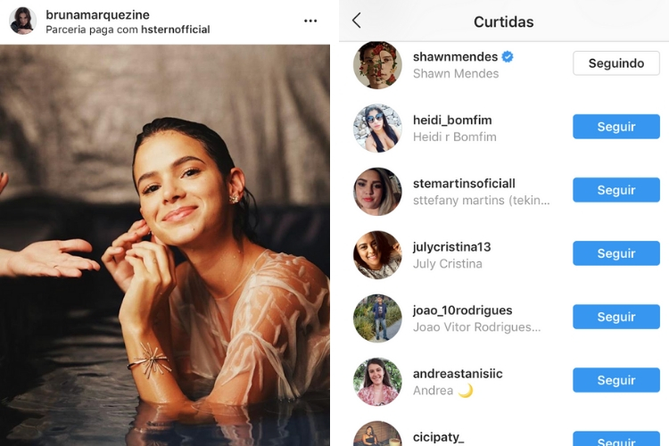 Até aí, tudo bem, a imagem coleciona mais de 1 milhão de curtidas, no entanto, uma se destacou, a do cantor pop canadense Shawn Mendes. Os internautas de plantão, atentos como sempre, notaram o like e começaram a apoiar o casal. “Bru. Vai que é teu”, comentou um fã, “Shawn Mendes, convida a Bruna para fazer um clipe seu”, sugeriu outro.