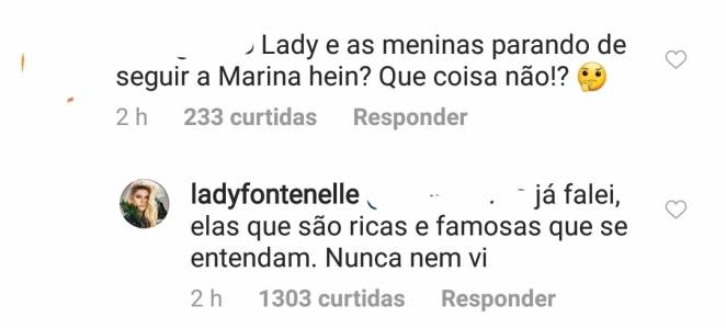“Lady e as meninas parando de seguir a Marina hein? Que coisa não!?”, escreveu ele. Fontenelle, então, com toda a elegância disparou: “Já falei, elas que são ricas e famosas que se entendam. Nunca nem vi”, disparou ela.
