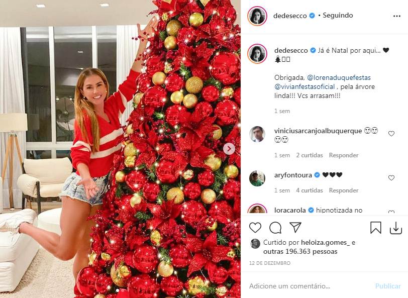 Deborah Secco nunca escondeu que ama decorar a casa para as festas de fim de ano. Ela também compartilhou com os seguidores sua árvore de Natal assim que armou a árvore natalina comemorou. “Já é Natal por aqui… ❤“, escreveu.