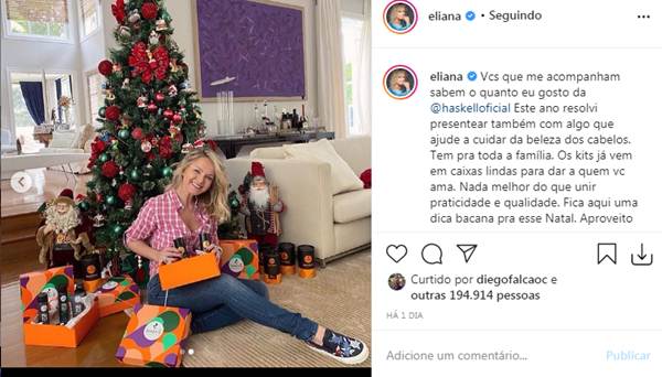 A apresentadora Eliana aproveitou uma campanha publicitária para exibir a decoração da sua árvore de Natal este ano. Bem colorida e cercada de bonecos do Papai Noel, a artista vai comemorar a data ao lado dos filhos, Arthur e Manuela, e do marido, Adriano Ricco.
