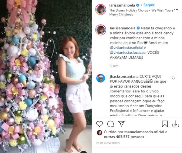 Larissa Manoela também entrou no clima natalino na casa nova. A atriz, que está escalada para uma novela na Globo, montou uma casa no Rio de Janeiro e mostrou a criatividade em sua árvore de Natal. “Natal tá chegando e a minha árvore esse ano é toda candy color pra combinar com a minha casinha aqui no Rio ! Amei muito”, comemorou.