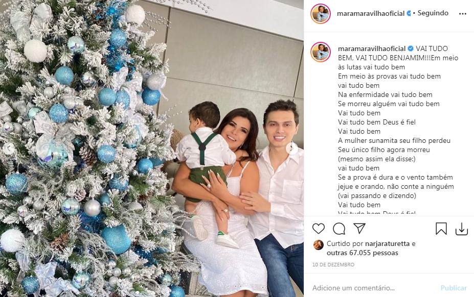 Mara Maravilha fez vários cliques com sua árvore de Natal. Em cada um deles a apresentadora escreveu palavras de esperança. No primeiro post, assim que montou a decoração, ela surgiu ao lado do marido e do filho, Benjamim. “Primeira árvore de natal que montei na minha vida (azul, branca e prata )”, escreveu na legenda.