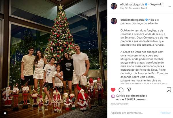 O apresentador Márcio Garcia montou uma grandiosa árvore natalina no final de novembro. Ele reuniu a família para registra o momento. Marcio postou um clique ao lado da mulher, Andrea Santa Rosa, e dos quatro filhos, Pedro, Nina, Felipe e João surgem cercados de soldadinhos, elfos e renas.