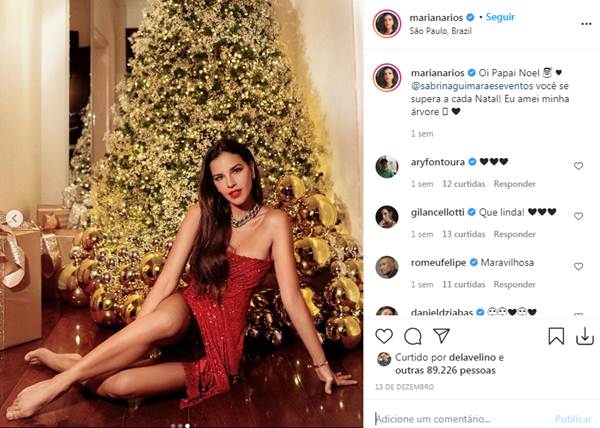 A árvore de Natal de Mariana Rios esse ano ficou bem dourada. A atriz, que passou por momentos difíceis depois de sofrer um aborto espontâneo, entrou no clima natalino. Na parte inferior, ela adicionou bolas douradas de diferentes tamanhos. Em cada parte do pinheiro, pisca-pisca e arranjos florais completaram a decoração. “Eu amei minha árvore ❤”, disse a atriz.