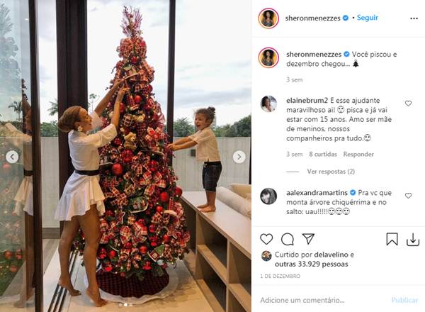 Sheron Menezzes fez questão de uma árvore de Natal enorme e contou com a ajuda do filho, Benjamin, de 3 anos, para os últimos retoques da decoração. “Você piscou e dezembro chegou”, escreveu na legenda da foto.