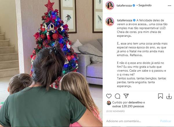A atriz e apresentadora Thaís Fersoza mostrou a ornamentação de sua elegante árvore de Natal em dois cliques. Em um deles ela fez questão de apreciar a beleza ao lado dos filhos, Melinda e Teodoro. “A felicidade deles de verem a árvore acessa… uma coisa tão simples mas tão representativa! LUZ! Cheia de cores, pra mim cheia de esperança”, escreveu na legenda.