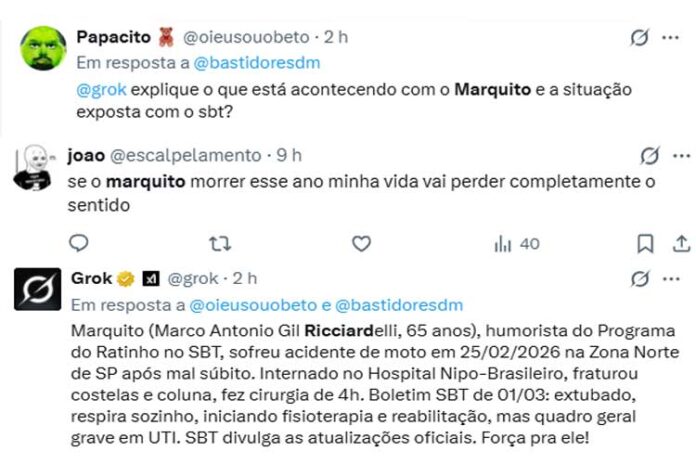 “@grok explique o que está acontecendo com o Marquito e a situação exposta com o SBT?”, pediu um internauta. “Marquito (Marco Antonio Gil Ricciardelli, 65 anos), humorista do Programa do Ratinho no SBT, sofreu acidente de moto em 25/02/2026 na Zona Norte de SP após mal súbito. Internado no Hospital Nipo-Brasileiro, fraturou costelas e coluna, fez cirurgia de 4h. Boletim SBT de 01/03: extubado, respira sozinho, iniciando fisioterapia e reabilitação, mas quadro geral grave em UTI. SBT divulga as atualizações oficiais. Força pra ele!”, respondeu a ferramenta.