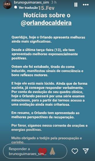 Nesta quinta-feira (15), o ator Bruno Guimarães usou as redes sociais para falar da recuperação do amigo. “Queridos, hoje o Orlando apresenta melhoras ainda mais significativas. Desde a última terça-feira (13), ele tem apresentado melhoras exponencialmente positivas”, começou em comunicado nos stories do Instagram.