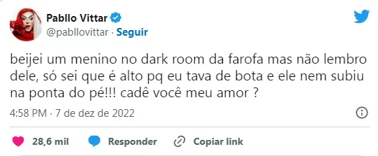 No Twitter, Pabblo saiu em busca do homem misterioso que beijou. “Beijei um menino do dark room da farofa mas não lembro dele, só sei que é alto porque eu tava de bota e ele nem subiu na ponta do pé!!! cadê você meu amor?”, escreveu no microblog.