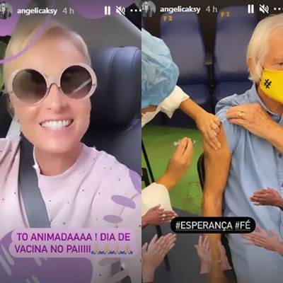 Angélica compartilhou uma série de vídeos em seus stories para mostrar o momento em que Francisco Ksyvicks, de 82 anos, recebeu sua primeira dose. Ainda no carro, a apresentadora se mostrou feliz. “To animada! Dia de vacina no pai”, escreveu.