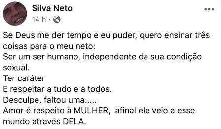 O pai de Thammy já se mostrou um avô coruja nas redes sociais. Ele fez um post sobre o neto, Bento, de 6 meses, filho de Thammy com Andressa Ferreira. “Se Deus me der tempo e eu puder, quero ensinar três coisas para o meu neto: ser um ser humano, independentemente da sua condição sexual. Ter caráter e respeitar a tudo e a todos. Desculpe, faltou uma…..Amor é respeito à mulher. Afinal, ele veio a esse mundo através dela”, escreveu Silva no Facebook.