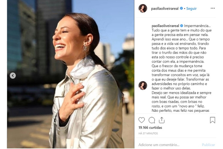 Em seu Instagram, Paolla Oliveira compartilhou duas fotos sorrindo e na legenda, parou para pensar sobre os 37 anos: “Impermanência… Tudo que a gente tem e muito do que a gente precisa esta em pensar nela. Aprendi isso esse ano… Que o tempo passa e a vida vai ensinando, tirando tudo dos eixos o tempo todo. Para tirar o trunfo das mãos do que não esta sob nosso controle é preciso contar com ela, a impermanência”, iniciou.