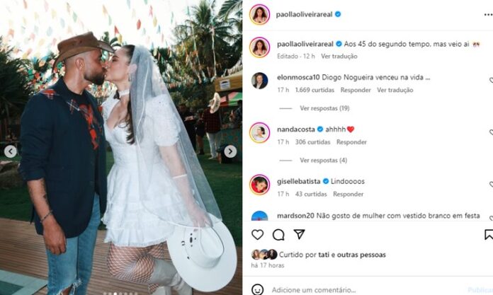 Através do feed no Instagram e depois de três anos de relacionamento com o cantor, Paolla Oliveira mostrou cliques inéditos do seu ‘casamento simbólico’ com o sambista: “Aos 45 do segundo tempo, veio aí”, escreveu ela com humor na publicação. A atriz, vestida de noiva caipira exibiu seu look em uma sequência de stories e os detalhes da celebração junina.