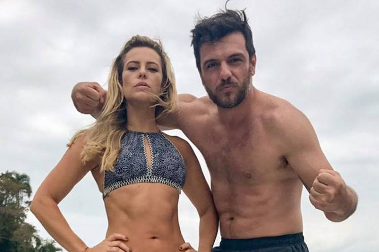 Na imagem, Paolla exibe a barriga chapada e sua boa forma de biquíni, enquanto o galã faz careta e mostra o abdômen sarado.