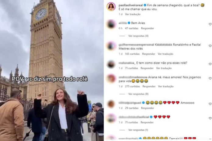“Ronaldinho e Paolla! Mestres dos rolês”, afirmou um seguidor. “Ariana, né, meus amores! Nos jogamos para a vida”, disse outra. “Rôlezeira”, disse outro. “Maravilhosa, minha gente!”, destacou mais uma fã.