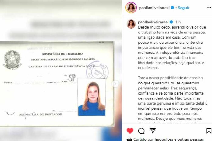 No Dia do Trabalho, comemorado nesta quarta-feira (01), Paolla Oliveira surpreendeu seus seguidores ao compartilhar uma imagem mostrando sua foto 3×4 na carteira de trabalho.