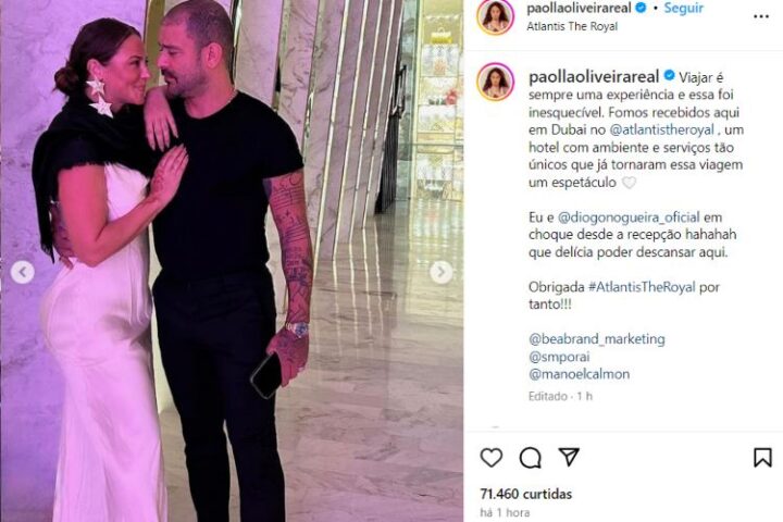 “Viajar é sempre uma experiência e essa foi inesquecível. Fomos recebidos aqui em Dubai no @atlantistheroyal, um hotel com ambiente e serviços tão únicos que já tornaram essa viagem um espetáculo. Eu e @diogonogueira_oficial em choque desde a recepção hahahah que delícia poder descansar aqui. Obrigada #AtlantisTheRoyal por tanto!!!”, escreveu ela, através do feed do Instagram, demonstrando felicidade com a recepção.