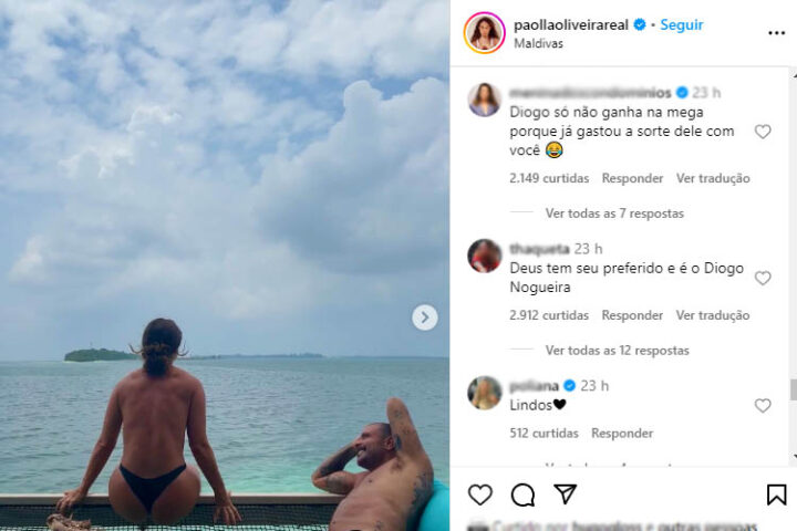 “Esse casal tem química, física, matemática, tudo junto!”, comentou uma seguidora. “Casal mais lindo”, disse outra. “Diogo só não ganha na mega porque já gastou a sorte dele com você”, brincou outra. “Deus tem seu preferido e é o Diogo Nogueira”, completou mais uma seguidora. “Tô sem palavras“, afirmou outro.