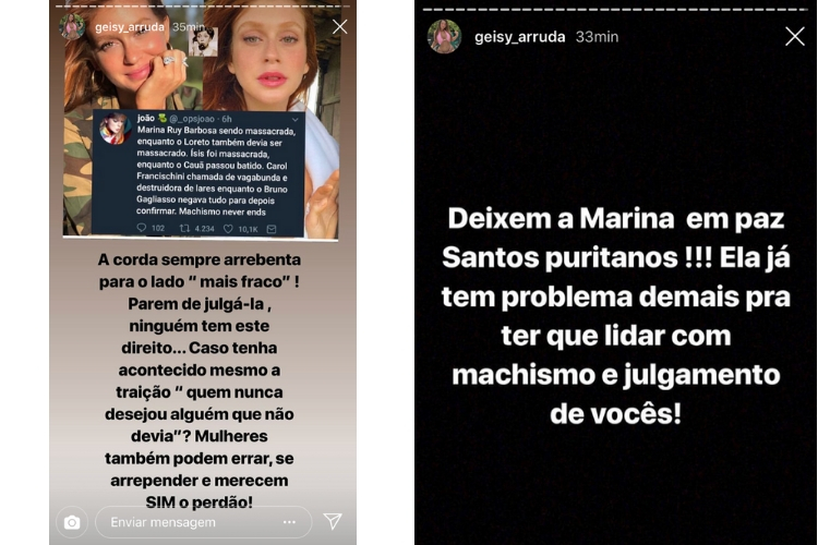 Geisy, usou as redes sociais na manhã desta quarta-feira (20), para defender Marina Ruy Barbosa. Em publicações na ferramenta stories de seu Instagram, a celebridade escreveu: