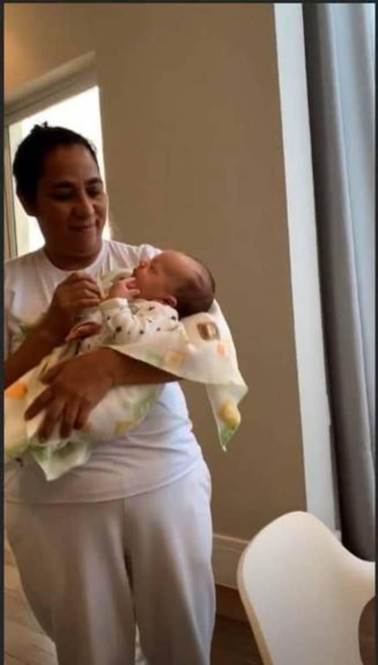 No Stories do Instagram, ela mostrou o recém-nascido sendo ninado pela babá. A foto, é um raro registro do pequeno que nasceu em abril.