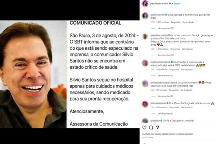 “Ai, meu Deus, que susto. O coração gelou agora quando vi a foto dele com o texto… Graças a Deus ele está bem, que assim seja por muitos anos ainda”, disse uma internauta. “Silvio Santos é muito amado e abençoado, já já estará 100% restabelecido!”, afirmou outra.