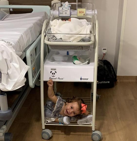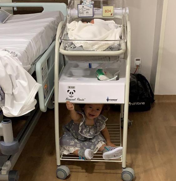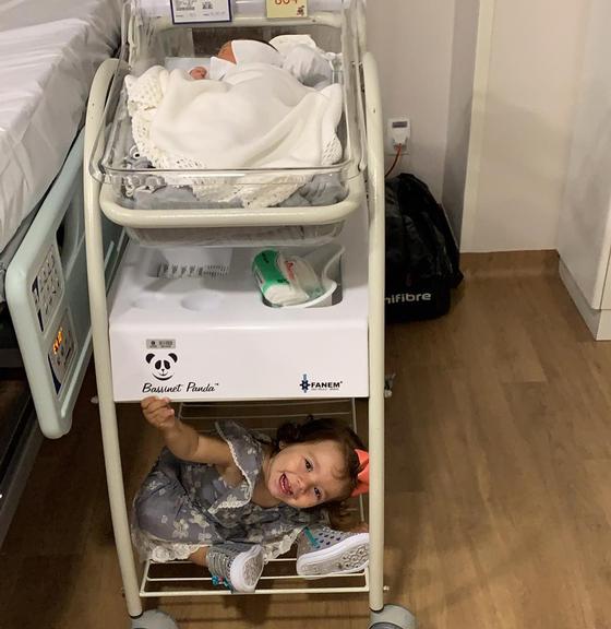 No click compartilhado nas redes sociais, a mamãe coruja mostra a pequena fazendo bagunça debaixo do berço do irmão recém-nascido, que ainda está na maternidade.