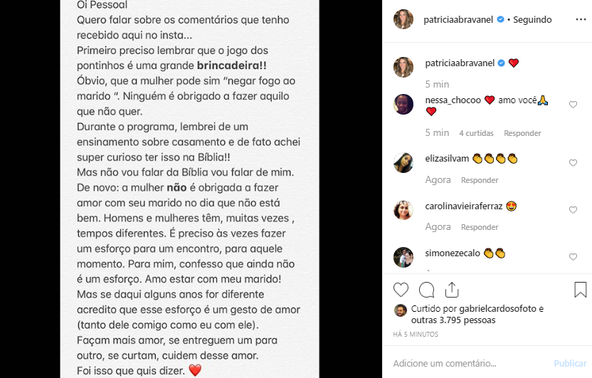 Na manhã desta terça-feira (3), Patricia foi até o seu Instagram oficial e fez uma postagem, com um texto, se pronunciando sobre o caso e se defendendo, explicando a sua colocação. Em determinado trecho, ela deixa claro: “Ninguém é obrigado a fazer o que não quer”.