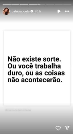Através dos stories no Instagram, Patrícia Poeta não se limitou ao revelar como que alguém consegue crescer na vida profissional: “Não existe sorte. Ou você trabalha duro, ou as coisas não acontecerão“, diz a publicação em seu perfil oficial.