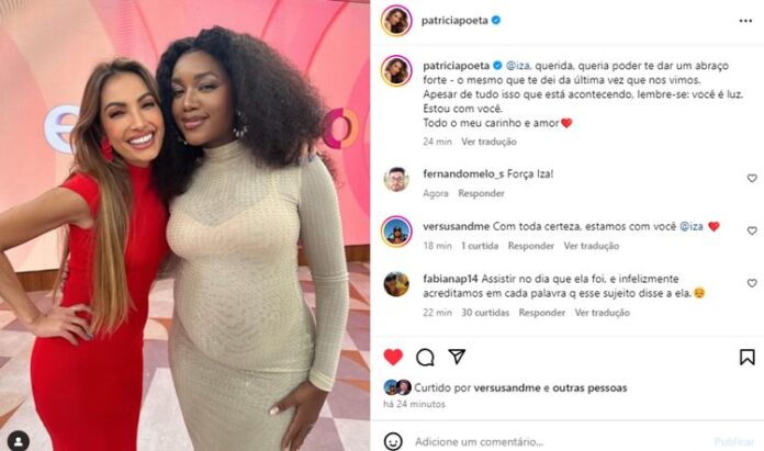 Depois de ter sido enganada pelas falsas palavras de Yuri, assim como Iza, Patrícia Poeta se solidarizou com a cantora, prestando seu apoio a amiga, mesmo de longe: “@iza, querida, queria poder te dar um abraço forte – o mesmo que te dei da última vez que nos vimos. Apesar de tudo isso que está acontecendo, lembre-se: você é luz. Estou com você. Todo o meu carinho e amor“, escreveu ela.