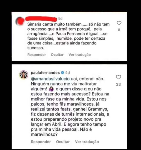 “A Paula Fernandes é igual. Se fosse simples e humilde, pode ter certeza de que estaria ainda fazendo sucesso“, comentou. Diante das falas feitas pela internauta, Paula Fernandes respondeu, dizendo que nunca maltratou ninguém e que está “na melhor fase de sua vida”.