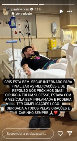 “Cris está bem, segue internado para finalizar as medicações e de repouso nos próximos dias!!!“, enfatizou ela, frisando que o marido ficará ausente dos palcos. “A cirurgia foi um sucesso. Estava com a vesícula inflamada e poderia ter complicações logo“, contou.